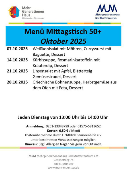 kleines Geld im MuM-Café. Der Mittagstisch richtet sich vor allem an alleinstehende Menschen, Paare und Gruppen ab 50+. Wir schließen selbstverständlich niemanden aus! Wer Hunger hat, ist