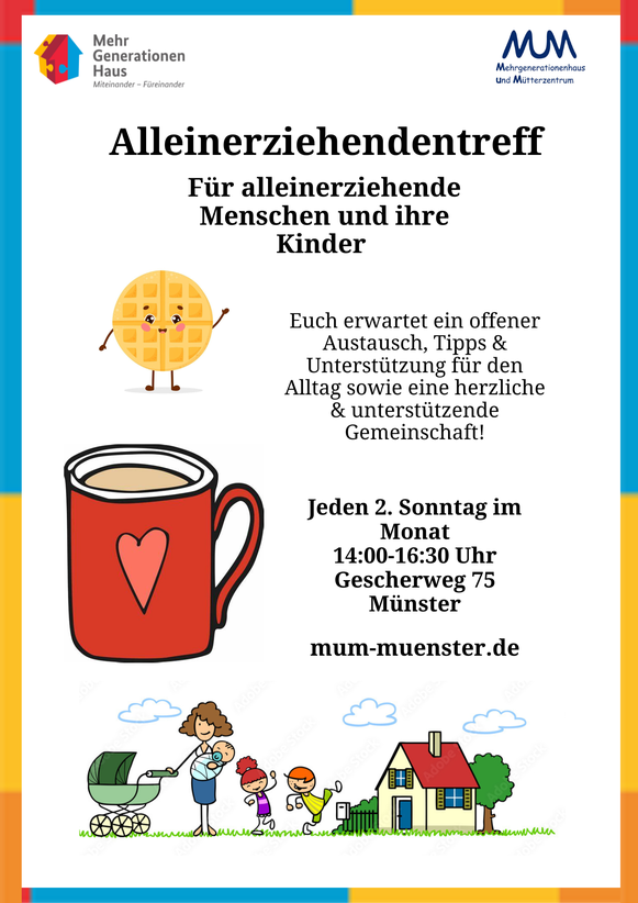 Bei unserem offenen Treff sind alle willkommen, die ihre Kinder alleine oder getrennt von dem anderen Elternteil erziehen. Wir gestalten einmal im Monat (Sonntagnachmittag) im MuM einen gemeinsamen Nachmittag. Wir wollen uns austauschen, gemeinsam Kaffee und Kuchen essen (alle bringen etwas mit) und mit den Kindern spielen.